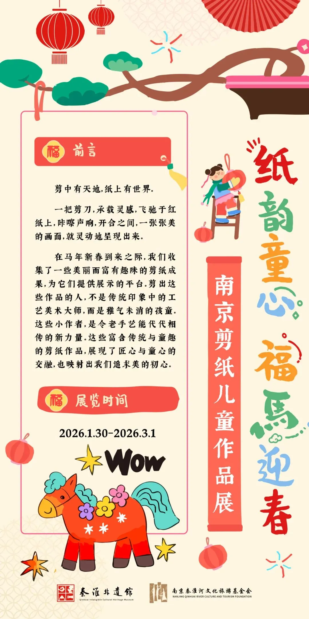 2026年1月30日至3月1日,“纸韵童心 福马迎春——南京剪纸儿童作品展”于秦淮非遗馆温情呈现。本次展览特别聚焦于儿童剪纸创作,旨在呈现传统非遗在当代少年儿童手中的生动传承。