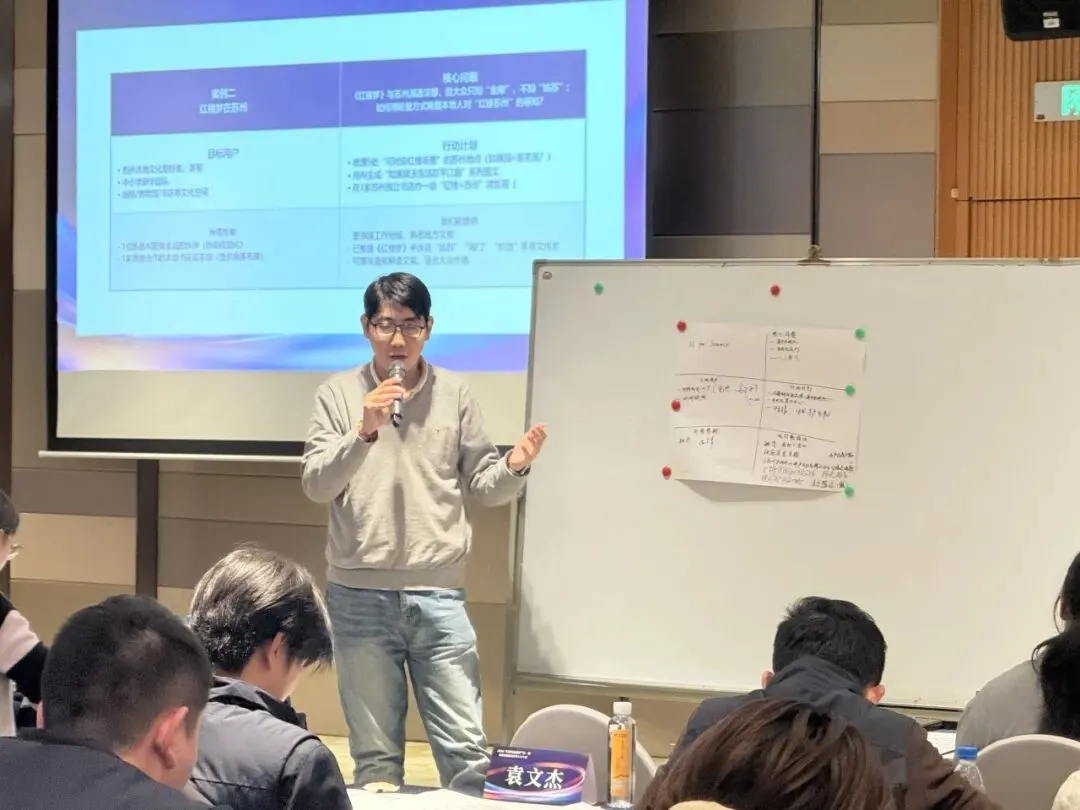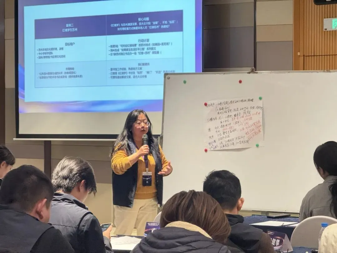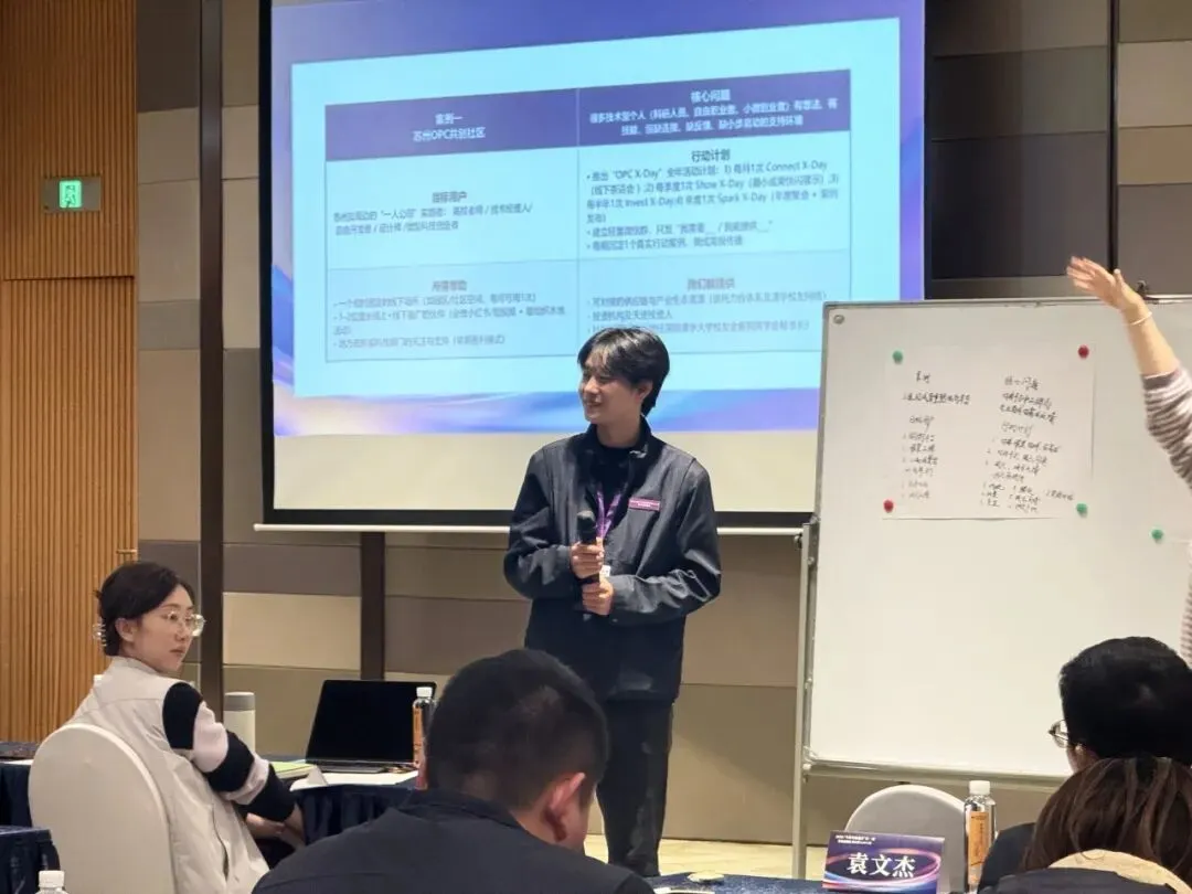 深圳市力合教育总经理助理曹琪介绍了“OPC需求共创画布”工具,引导学员从项目名称、核心问题到资源需求进行系统梳理。学员们踊跃参与,有的小组聚焦“苏州OPC共创社区”建设,探讨如何为技术型个人提供连接和支持;有的小组则围绕“红楼书坊”项目,讨论文化创新方案。