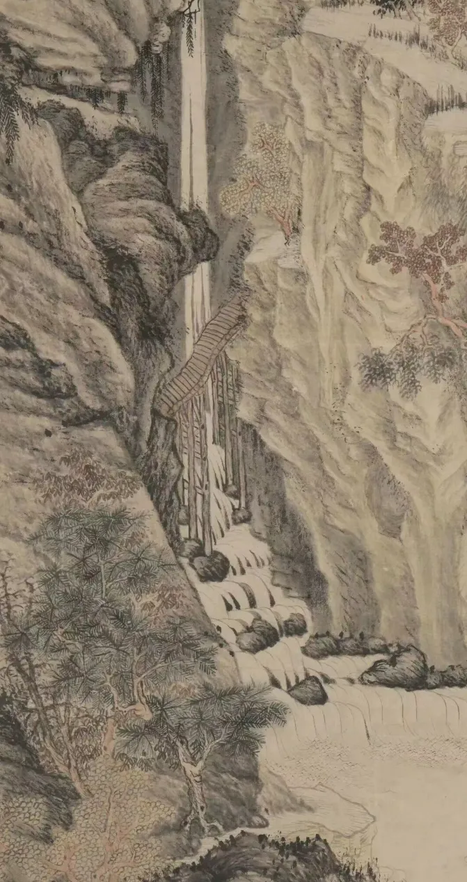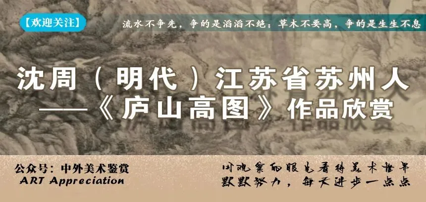山谷间有清溪山瀑从崖壁中飞溅而出,像是一条白锦直挂于山中。千尺瀑布飞泄而下,水流击石,仿佛发出震耳欲聋的声响。水流顺势而下汇于峡谷潭水之中。一老者立于溪前,赏此美景。《庐山高图》是沈周四十一岁(1467年)时为贺老师陈宽(醒庵)的七十岁寿辰而精心绘制的巨幅山水,因陈宽先祖是江西人,又以“庐山陈汝言”自称,所以沈周以此祝寿。投稿邮箱:daoqin888@foxmail