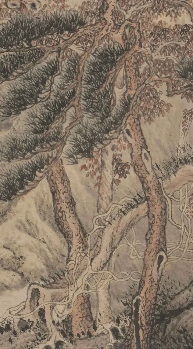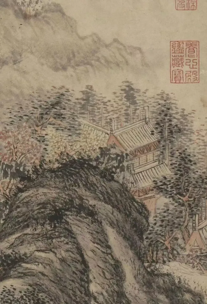 此图描绘的是庐山的景象,画中有白云、杂树、石阶、小路以及人物等。这幅图在技法上借鉴元代画家王蒙的笔意,笔法稳健,气势雄沉,具有强烈的节奏感和力量感。山峰多用解索皴,皴染厚重灵动;