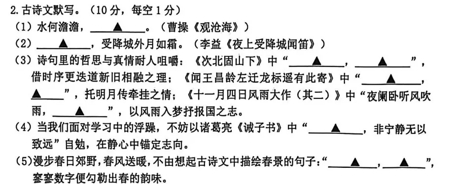 我们复习卷第一套的第一句,第四句是一样的。虽然押中比例不高,但默写和字词一样也是要全部掌握的。