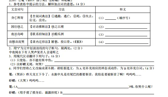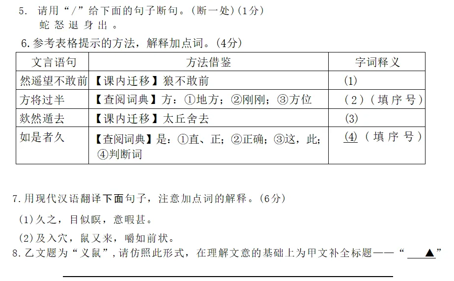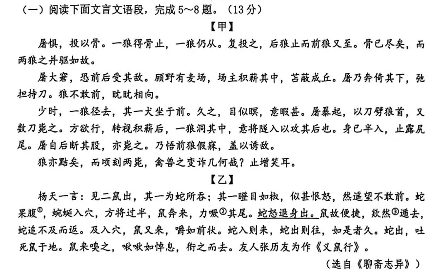 考的是对比阅读,课本里的《狼》和《聊斋志异》里的义鼠。考查方向为断句、实词含义、句子翻译和文段理解。