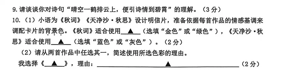 再往后就是诗歌阅读,这次考的依然是对比阅读,刘禹锡的《秋词》和马致远的《天净沙 秋思》。