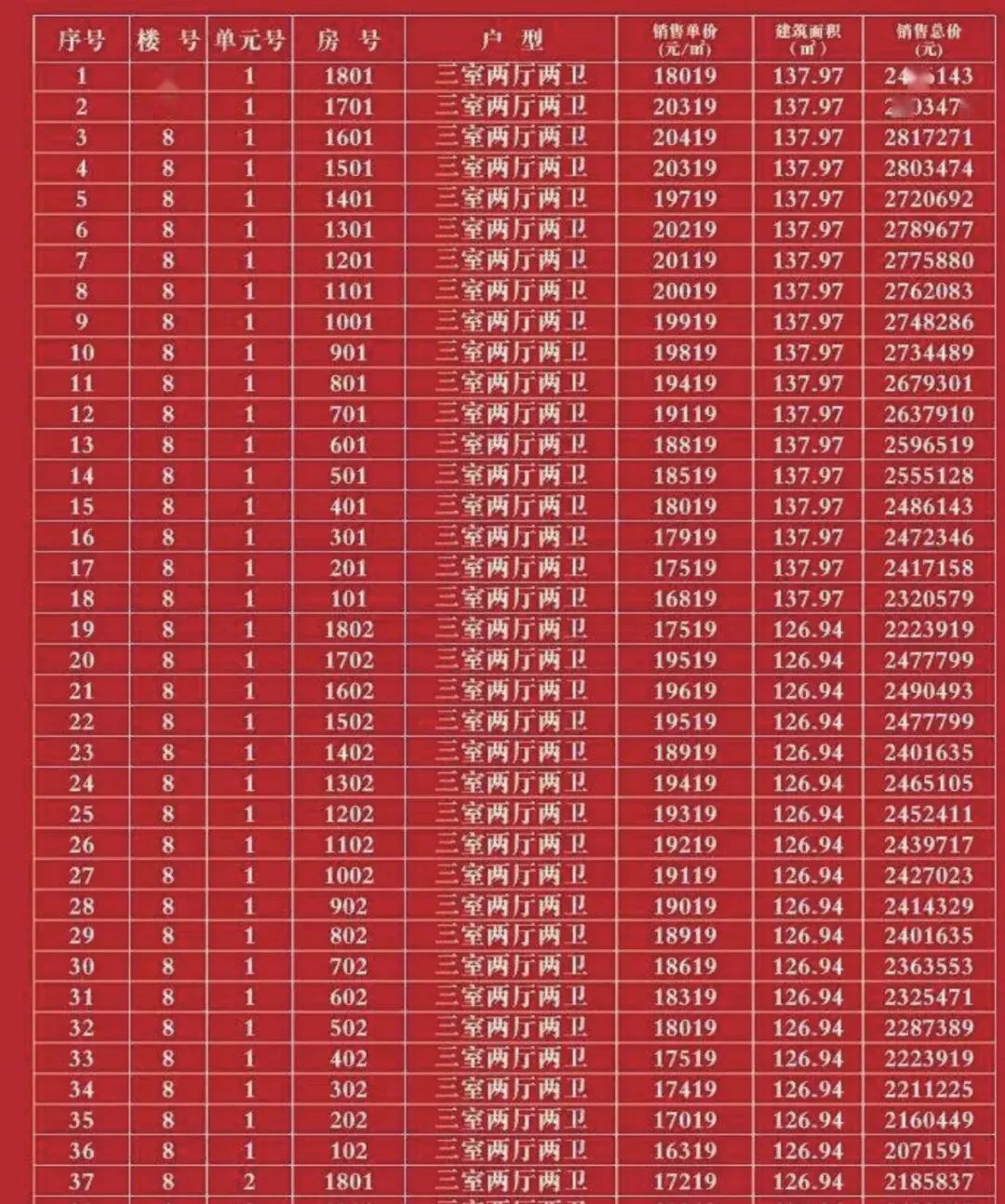 2020年11月首开:首开楼栋为8#、11#、15#、16#,均价17,900元/㎡,起售价13,419元/㎡。具体楼栋价格如下: