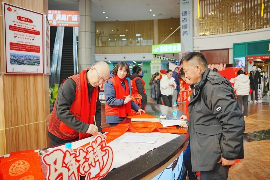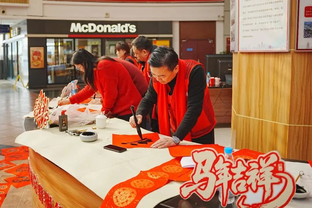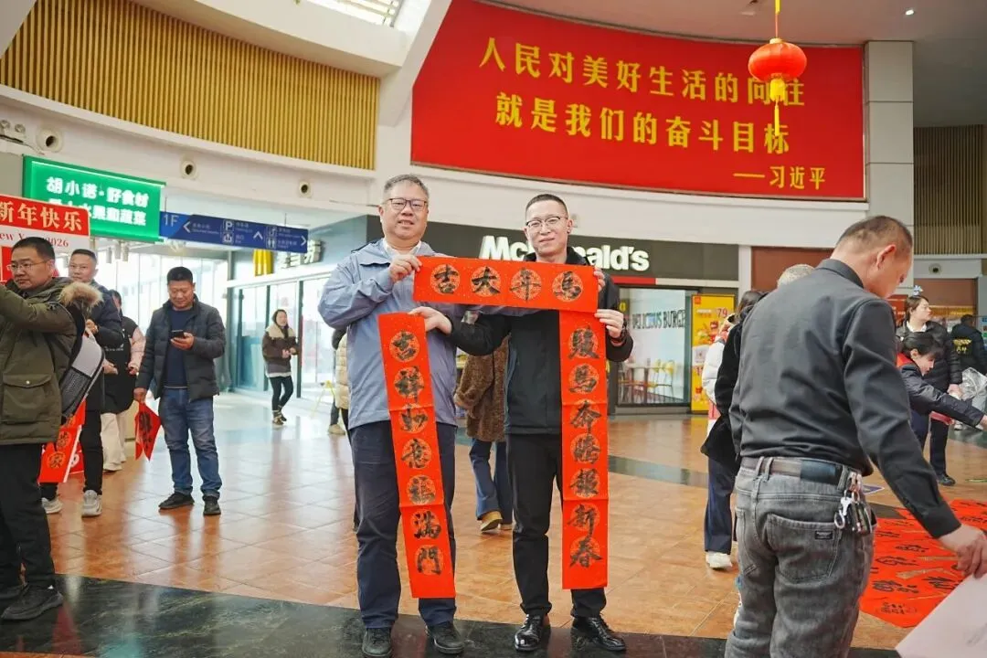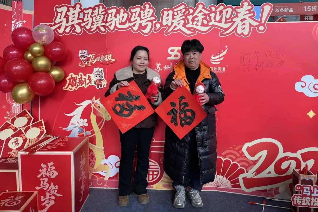 活动现场最聚人气的莫过于新春送福区。苏州交投集团党委委员、纪委书记吴文胜受邀与苏州高速公司书法爱好者同台挥毫。红纸铺展,墨香四溢,一幅幅蕴含马年吉祥寓意和高速平安祝愿的春联、福字瞬间写成。与普通印刷品不同,这些手写祝福承载着温度与诚意,成为司乘们争相领取的“最暖年货”。一位拿到定制春联的货车司机笑言:“这比路上买的任何特产都珍贵,是把‘福气’直接带回家了。”