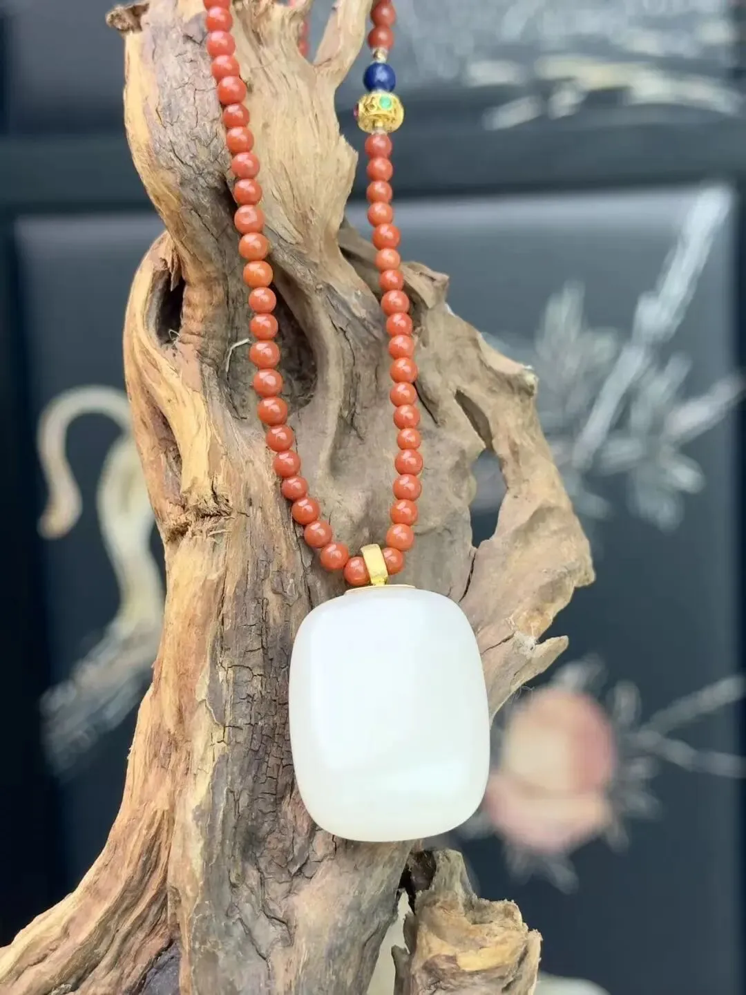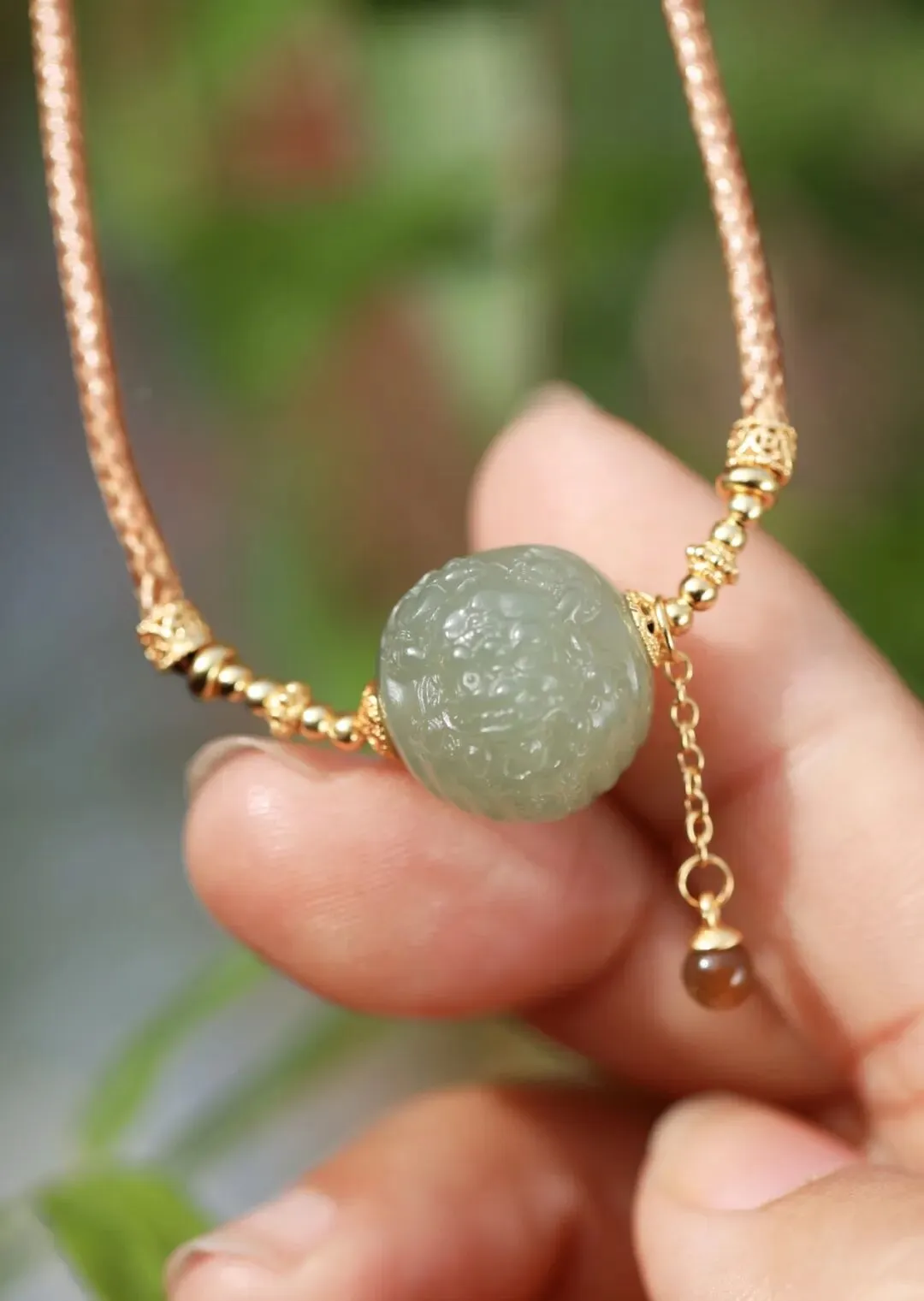 无事牌用了18K金万能扣头,可以放在任何绳子、链子上。强烈建议搭配这条不到千元的南红小珠链。