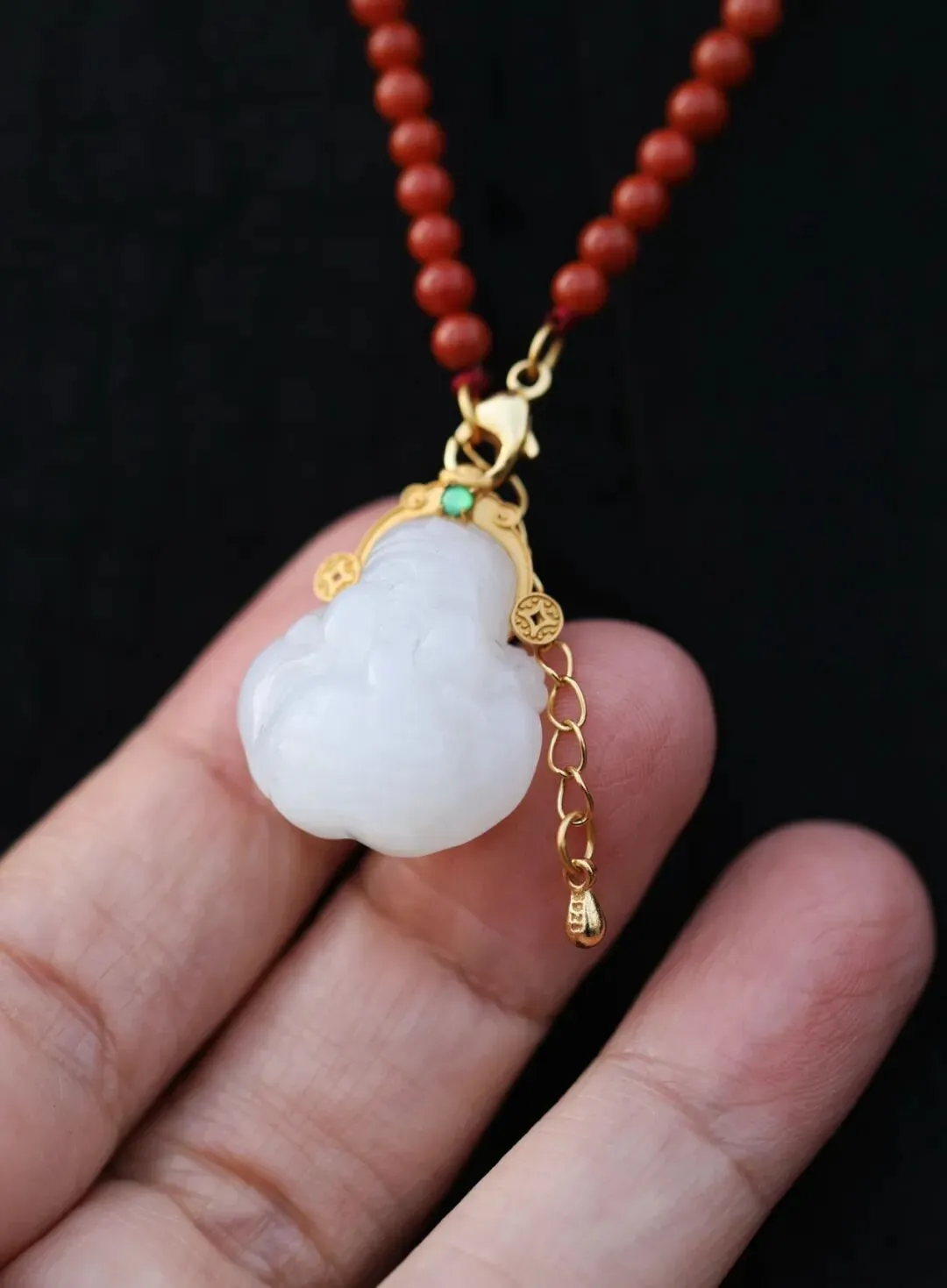 有了这个组合,牌子可以单独戴,链子还能配其它吊坠。比如说这个18k金的小财神,吊在南红上也好看。