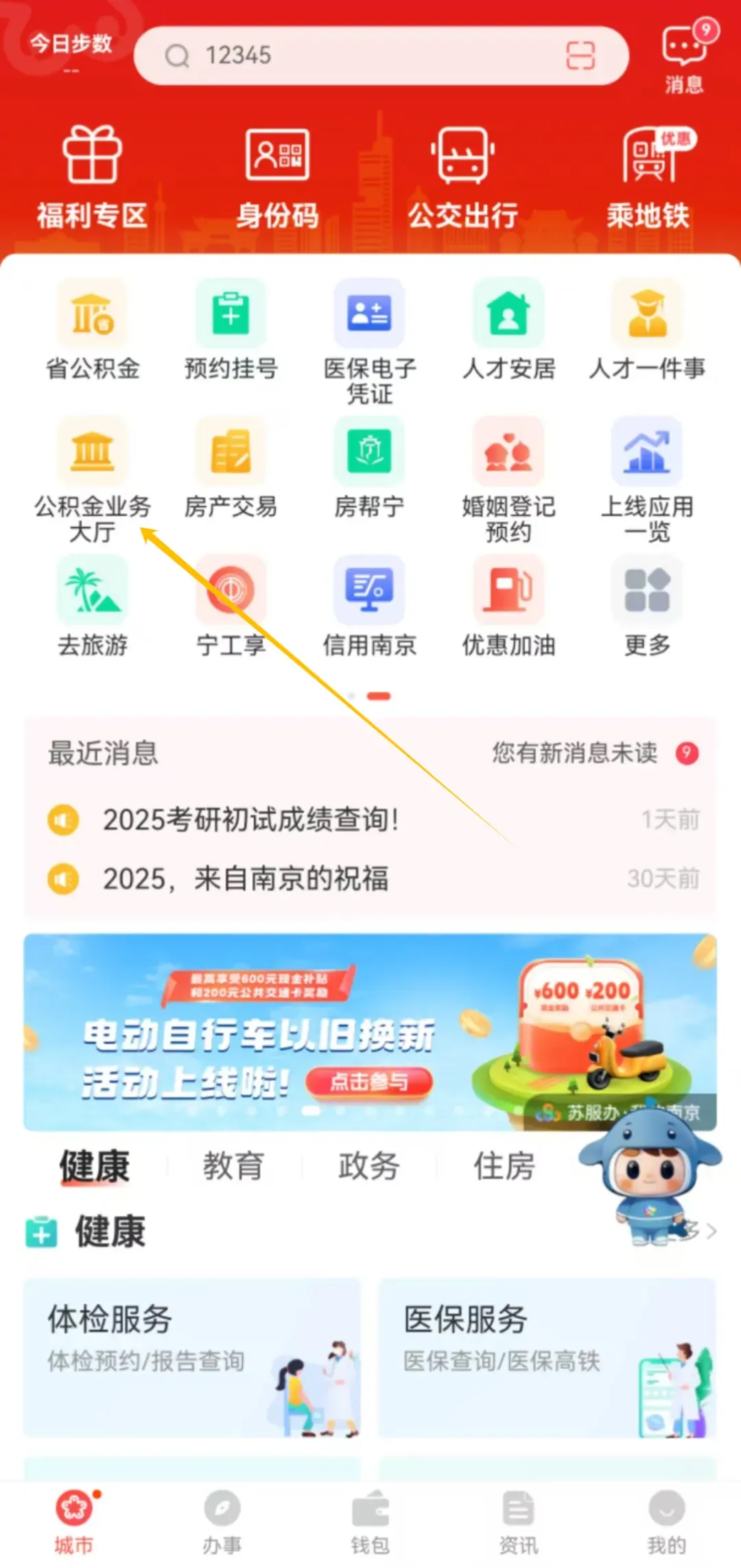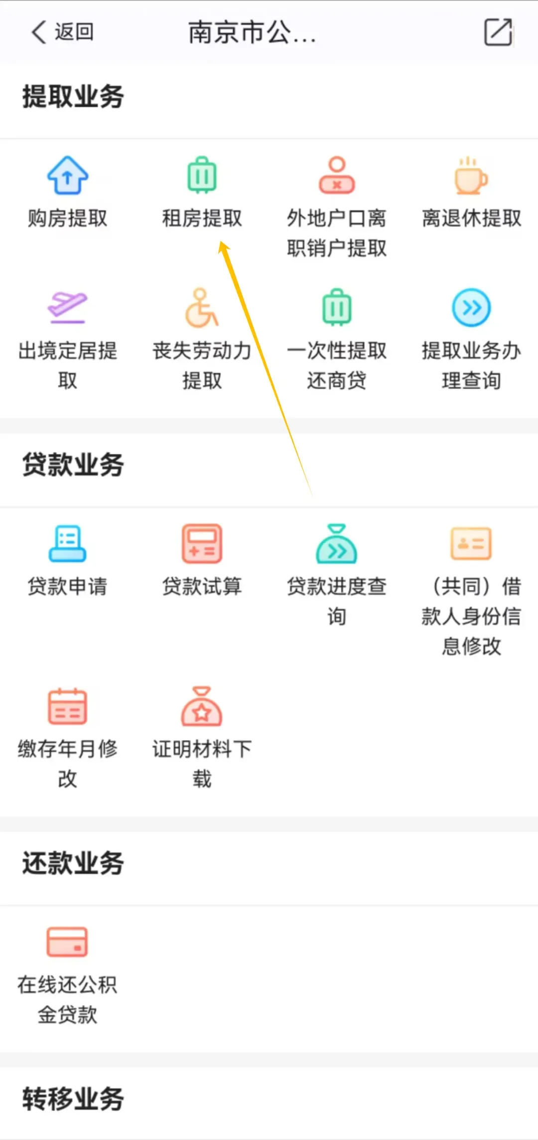 在“我的南京”APP首页找到“公积金业务办理大厅”,点击“租房提取”。