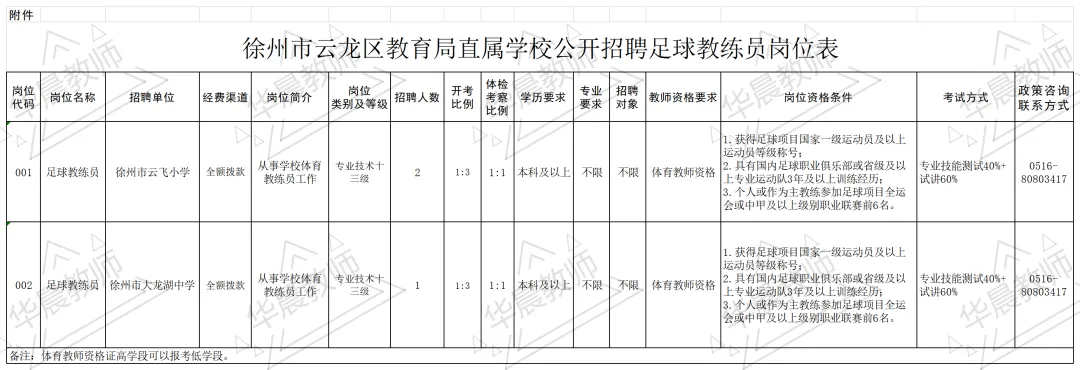 1.徐州市云龙区教育局直属学校公开招聘足球教练员岗位表