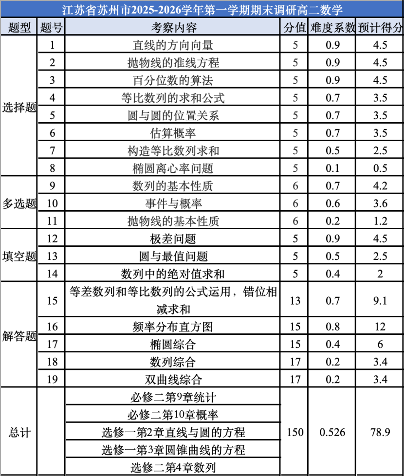 首先来看看这份《苏州市2025学年高二上期末统考数学卷》的考点分布和难度分布。