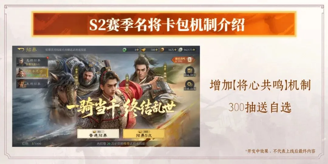 S2赛季的名将卡包,会加入【将星共鸣】机制,累计300抽即可送1个武将自选。
