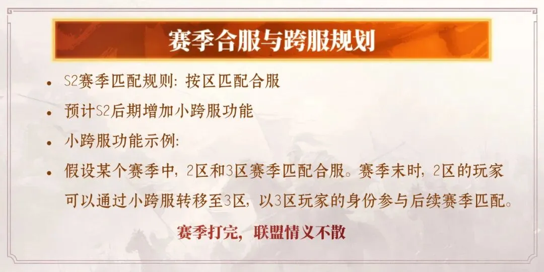 针对赛季合服与跨服规划问题,S2赛季后期将上线小跨服功能。