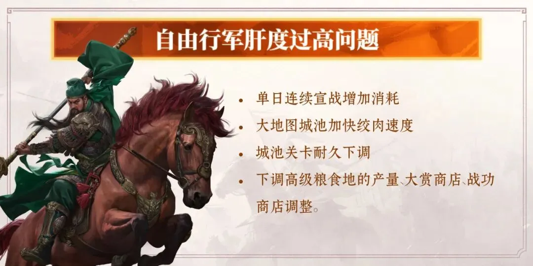 同时,部分城池关卡的耐久也会相应下调,并调整粮食的产出和消耗,在不影响核心战斗乐趣的前提下,降低一些肝度负担。