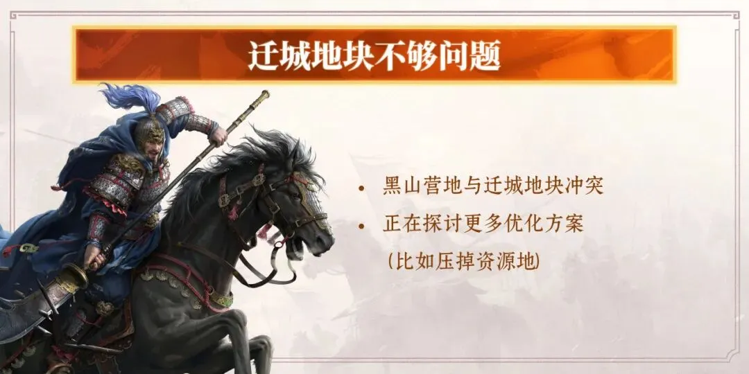 首先,目前位置不够的原因之一,是黑山营地玩法的刷新点位会挤占一部分迁城地块,我们会对此做优化调整。