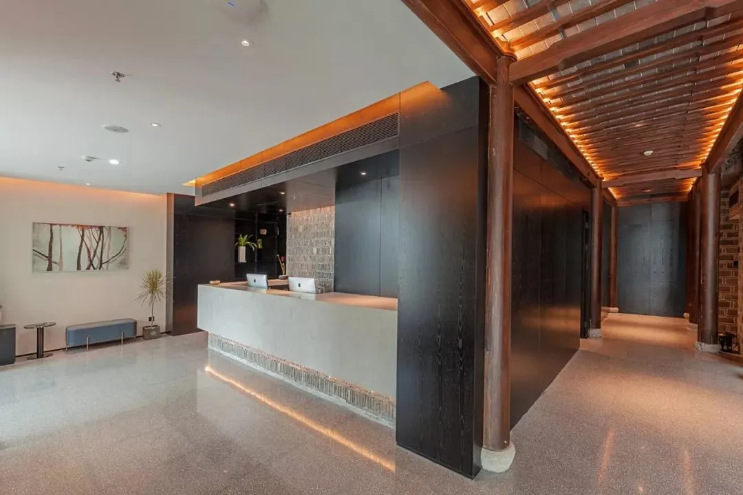 推开金属质感的大门,想象中阴沉古朴的传统装修并未出现,取而代之的是线条简约的标准化前台,老宅的门柱横梁反而变作了现代线条的整齐装饰。