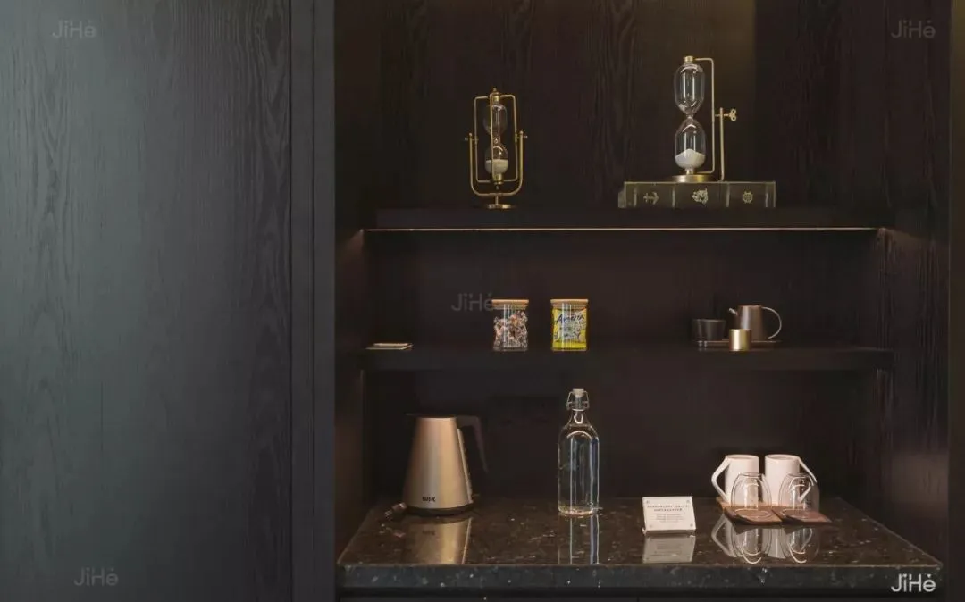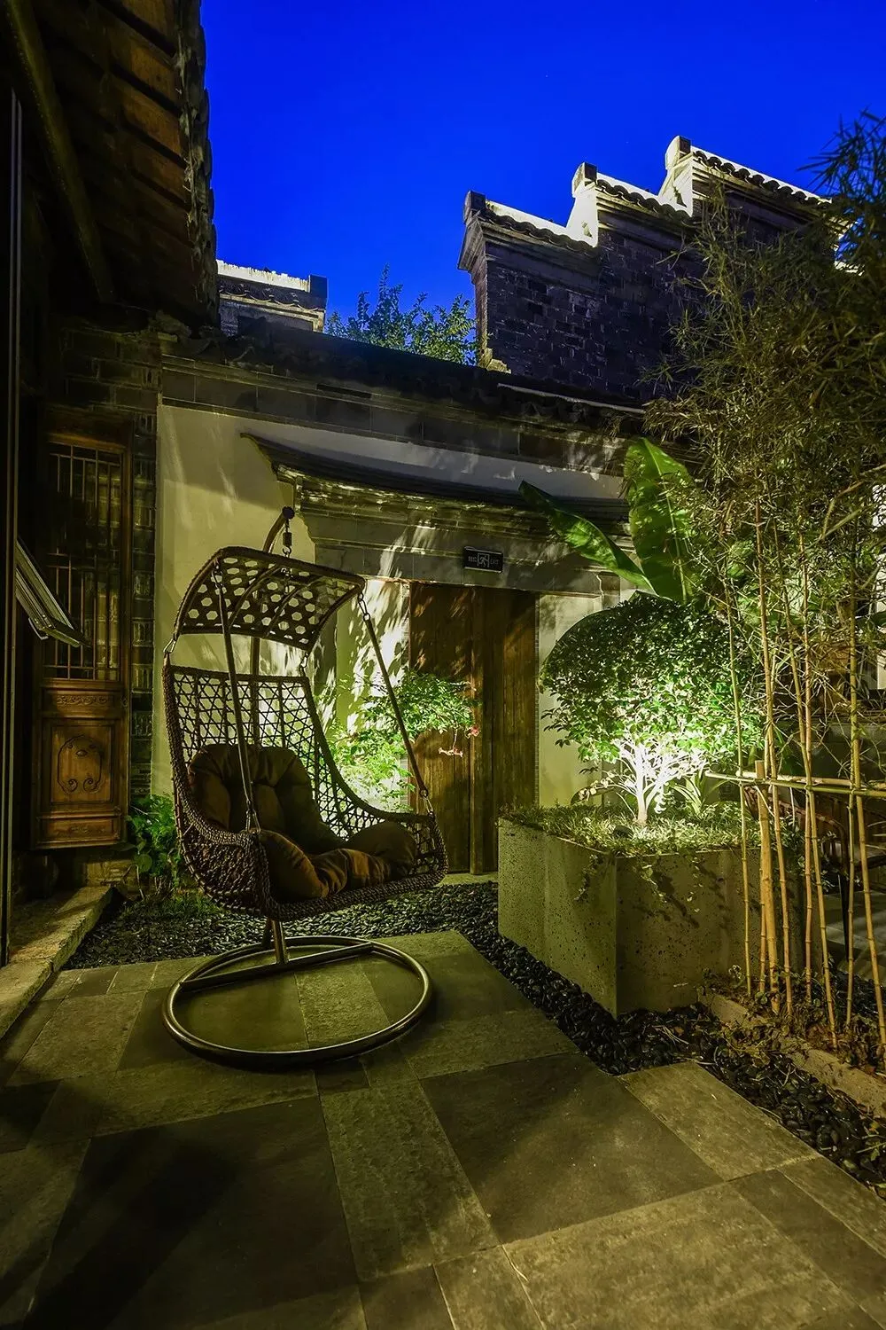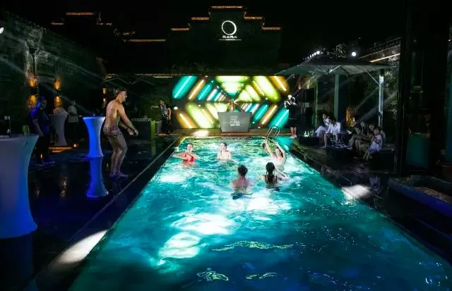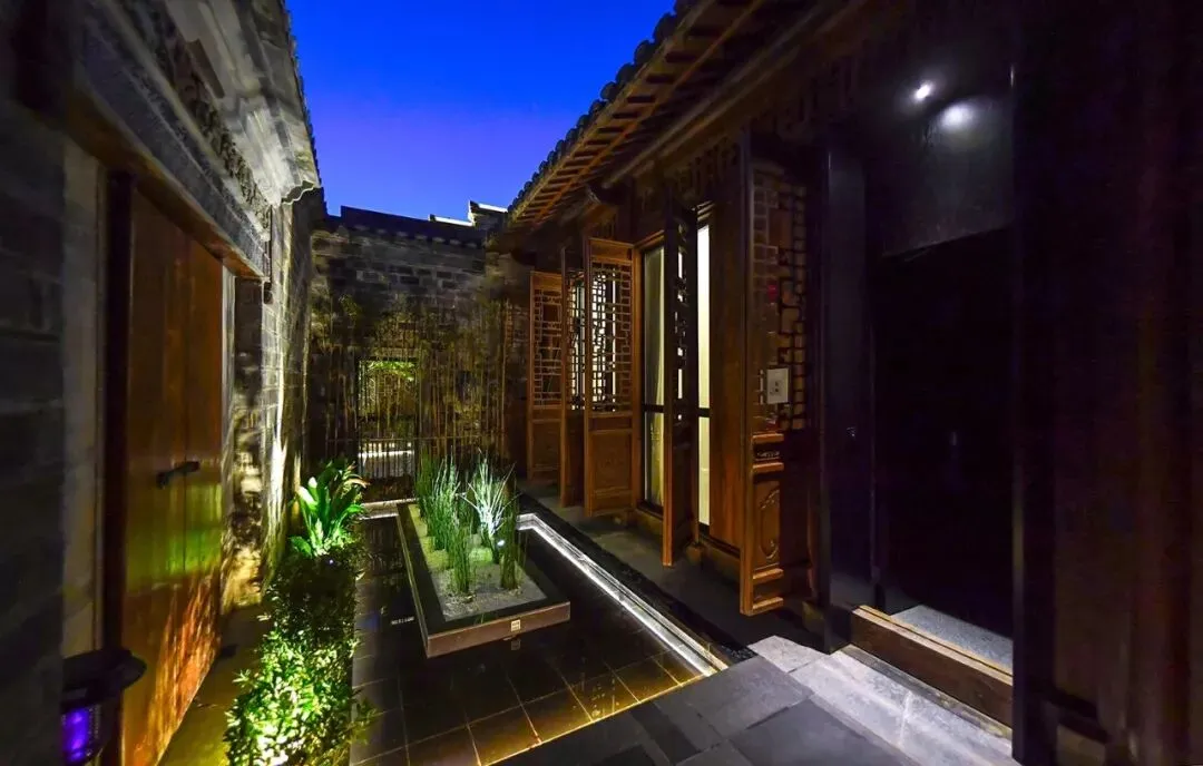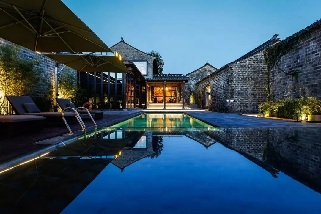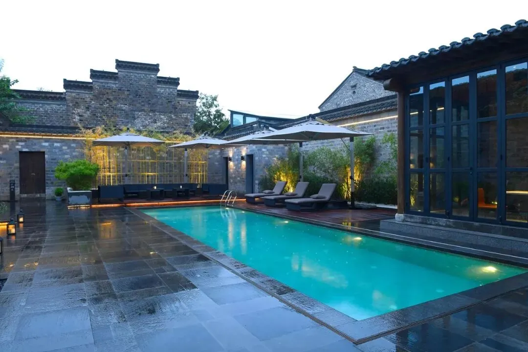最令人惊喜的还要数庭院中那方充满时尚之感的泳池。嵌入地面的方正造型、精心布置的灯光,徽式的马头墙和古色古香的门窗搭配得相得益彰。一开业便成为了许多时尚派对、小型品牌发布会的争相选择。