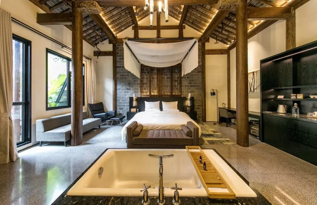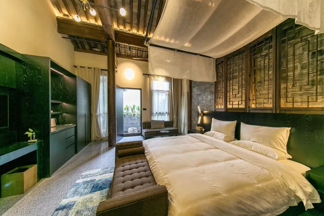 每间客房的横向面积比一般民宿开阔许多,单层的空间,房高高达6米,将建筑老框架完全展现,置身其中没有丝毫压抑之感。整墙的落地窗将庭院景观完全引入,充分的采光抵消了老宅的阴沉,简洁的推拉门,雕花的传统门窗、隔屏又守住了古香古色的味道。