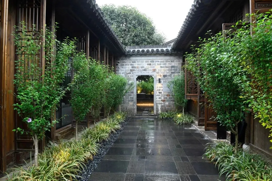 除了作为窗外风景,每间客房和庭院也是相通的,其间还有若隐若现的水脉串联,使生长其间的竹林、芭蕉焕发出勃勃生机,青葱的藤蔓甚至爬满整片斑驳的墙壁,将绿意直接挂在屋檐。