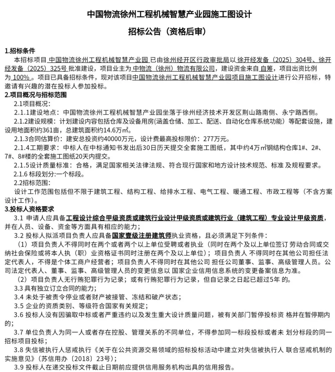 中国物流集团徐州智慧物流中心产业园项目位于徐州经开区荆山路南、永宁路西,项目规划占地面积361亩,规划建筑面积14.6万平米,建设集线边物流、整车发运、仓储配送为一体的现代化国际智慧物流中心。