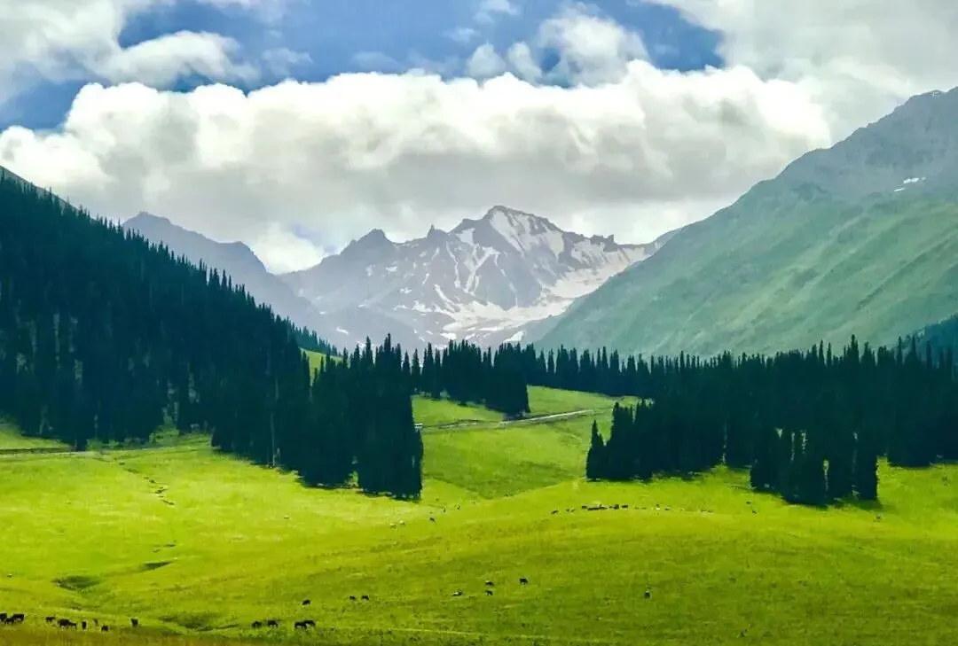 驼铃带雨毡房过,云朵沾花草甸莹。