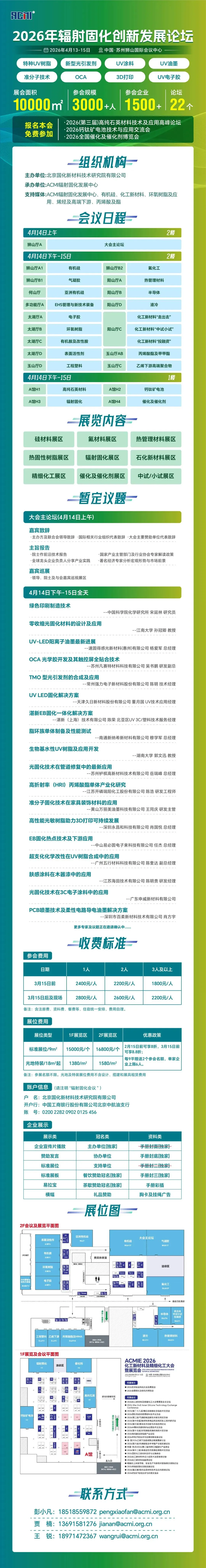 大会同期将举办“2026化工新材料及精细化工大会暨展览会(ACMIE2026)”。活动共设20场主题研讨会,主题涵盖辐射固化、电子胶、环氧树脂及有机胺、乙烯下游高端聚合物、特种工程塑料、丙烯酸及酯、甲基丙烯酸甲酯、半导体材料、氟材料、液冷、热管理材料、有机硅、高纯石英、气凝胶、表面活性剂等重点方向,参会规模3000人,参加企业1500家、展示面积10000平米。
