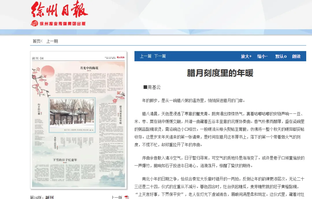 今天向文友们分享《徐州日报》副刊邮箱。刊物投稿先看栏目,报纸投稿细看版面。祝贺本群周基云老师发表散文《腊月刻度里的年暖》,并无私分享版面及邮箱。投稿一定要广开门路,一定有计划地、坚持不懈地投稿,时间长了,就会源源不断,进入良性循环。