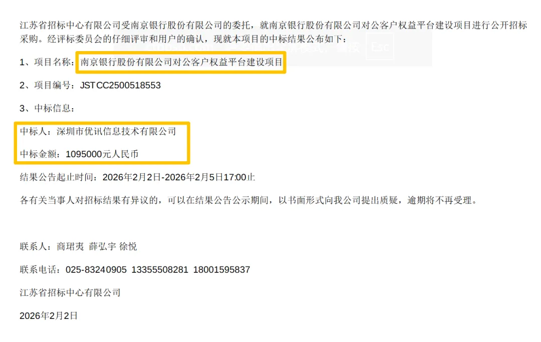 【中标】优讯信息109万 | 南京银行对公客户权益平台建设项目中标公示