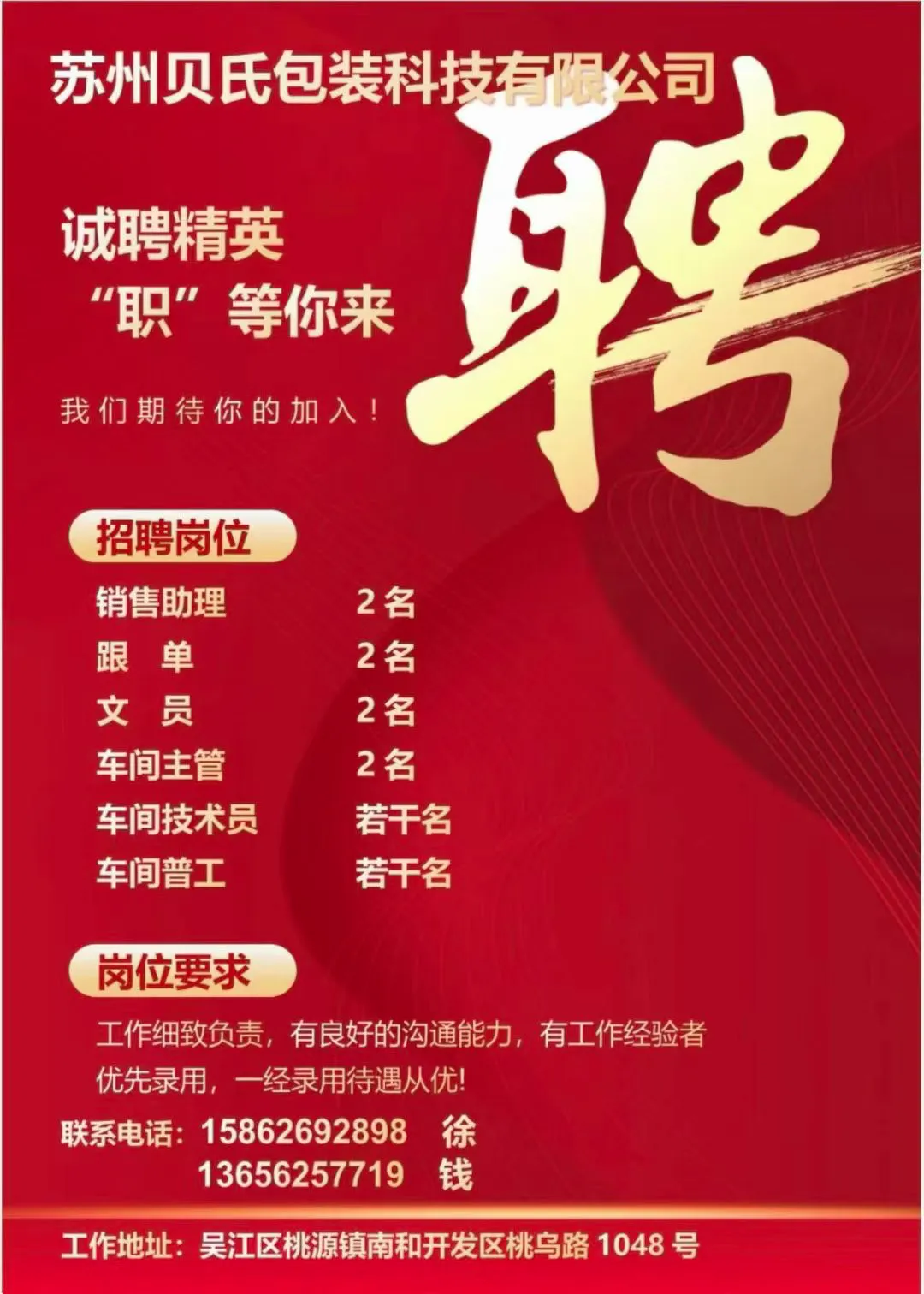 【招聘启示】追梦贝氏,不负韶华 | 苏州贝氏包装科技有限公司诚聘精英