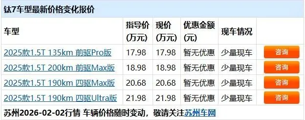 【苏州车网讯】近日,苏州车网编辑从方程豹苏州高新中心获悉,方程豹钛7售价17.98万起。销售人员表示,方程豹钛7店内少量现车,致电/到店详谈还能享受更多购车优惠。