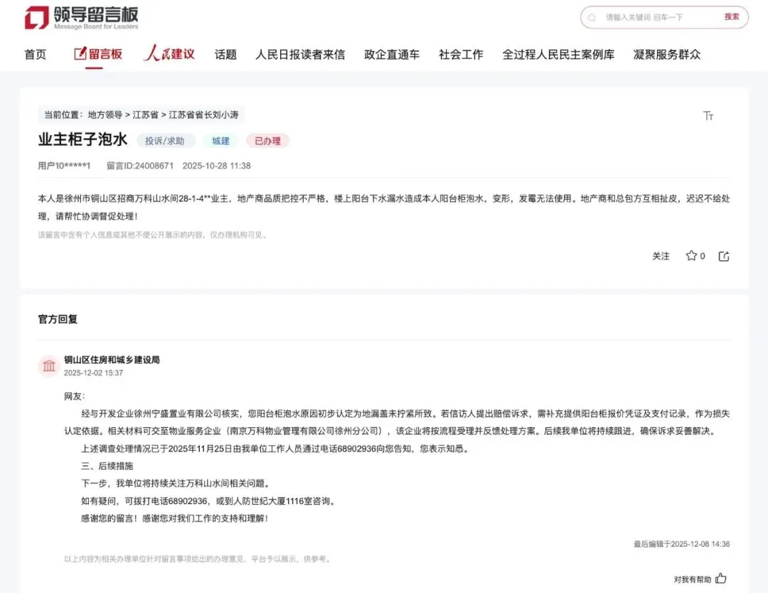 2025年12月2日,铜山区住房和城乡建设局针对该投诉作出正式官方回复。经工作人员与项目开发企业徐州宁盛置业有限公司逐一核实、排查后,初步认定业主阳台柜泡水的原因系地漏盖未拧紧,导致积水渗漏所致。针对业主可能提出的赔偿诉求,官方明确需补充提供阳台柜的报价凭证、购置支付记录等材料,作为损失金额认定的核心依据,相关证明材料可提交至小区物业服务企业南京万科物业管理有限公司徐州分公司,由物业公司按既定流程受理后,同步反馈具体处理方案。