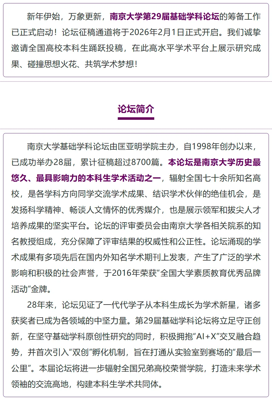 南京大学基础学科论坛是未来学术领袖展示才华的摇篮,是激发创新、探索前沿的沃土。我们期待您的积极参与,共同谱写基础学科发展的新篇章!