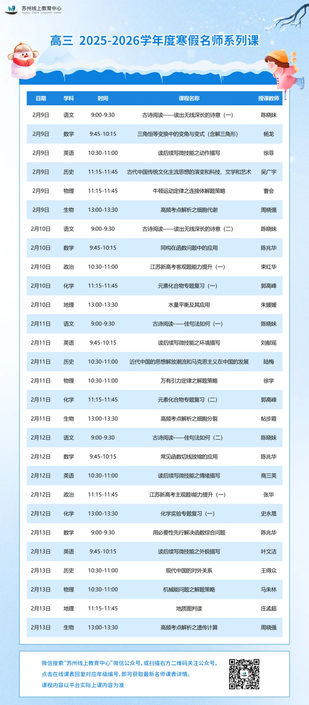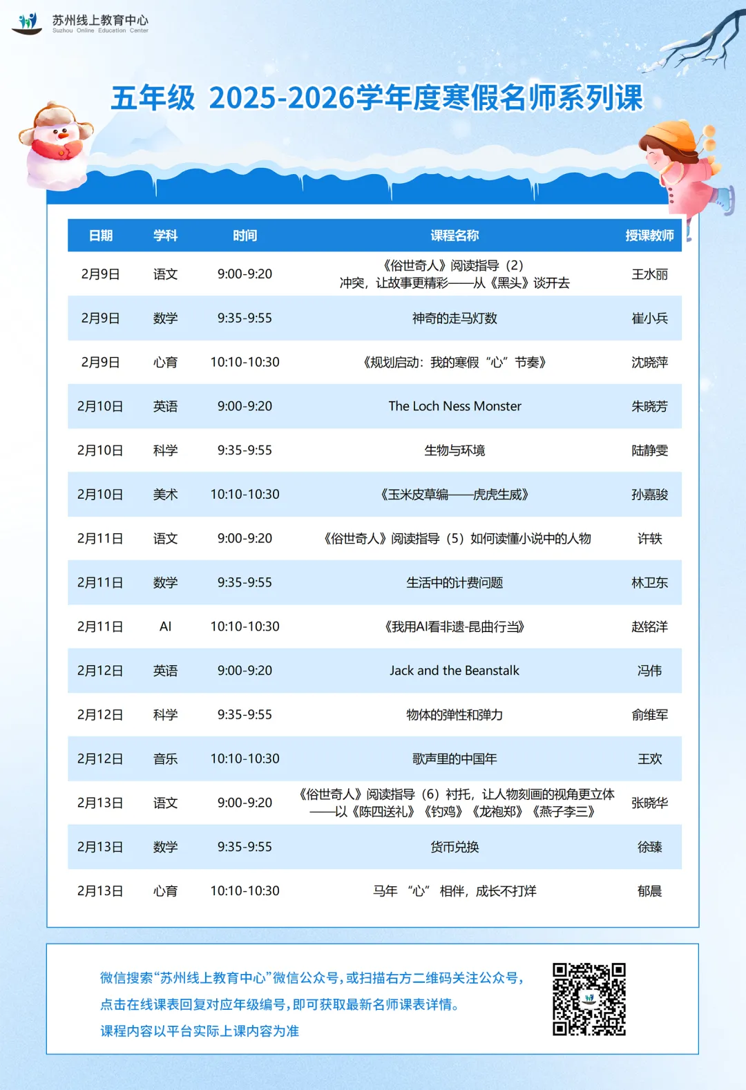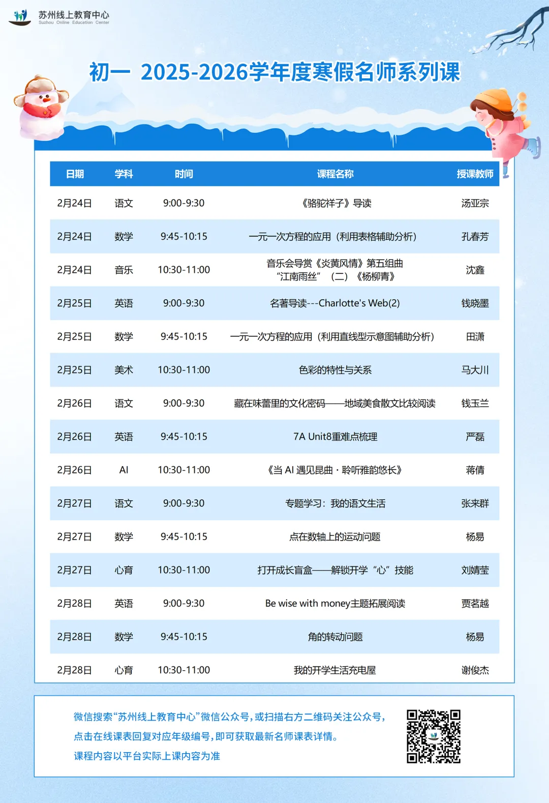 本次寒假名师系列课程将于2月9日(周一)开课,持续至2月28日(其中春节法定假日课程暂停)。具体每日课程内容,请登录苏州线上教育中心平台或APP,选择“市级推荐课程”专题中查看。
