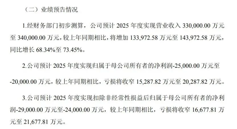 归属于母公司所有者的净利润-2.5亿元至-2.0亿元,较上年同期相比,亏损将收窄1.53亿元至2.03亿元。