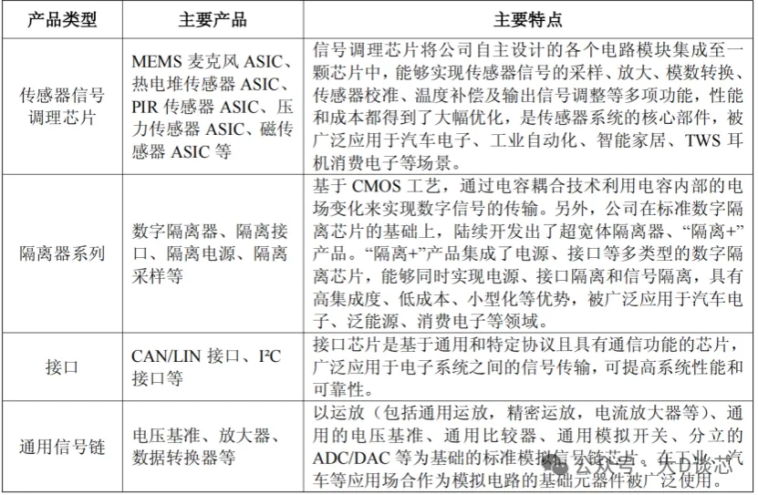 信号链芯片是系统中信号从输入到输出的路径中使用的芯片,包括信号的收集、放大、传输和处理的全部过程,主要包括线性产品、隔离产品、转换器产品、接口产品等。公司信号链产品涵盖了信号链细分领域中的信号调理芯片、隔离器、接口、通用信号链等,具体如下: