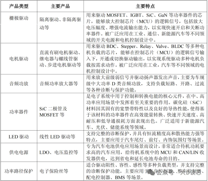电源管理芯片是在电子设备系统中实现对电能的变换、分配、检测及其他电能管理职责的芯片,是电子设备中的关键器件,电源管理芯片同步于电子产品技术和应用领域升级,产品种类繁多。公司的电源管理产品主要包括栅极驱动、供电电源、LED 驱动、电机驱动、音频功放、功率路径保护等,具体如下: