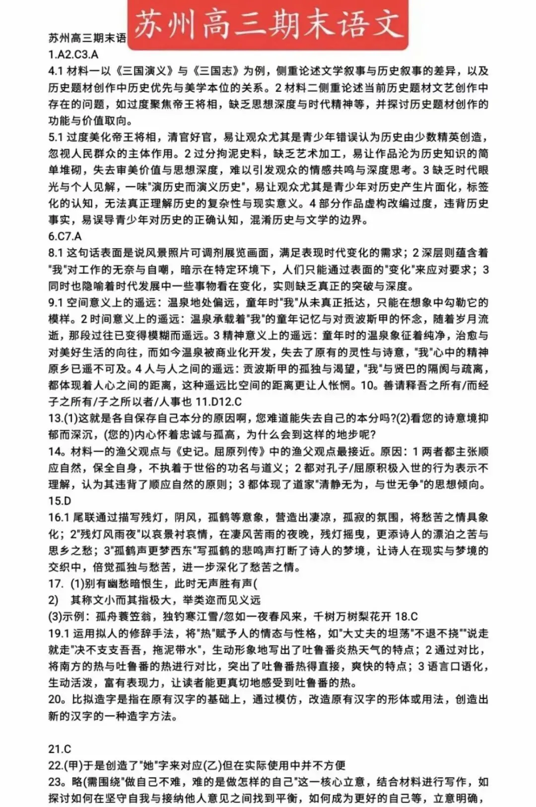 全科发送!苏州市高三期末考试2026届高三期末阳光调研卷全科答案及试题