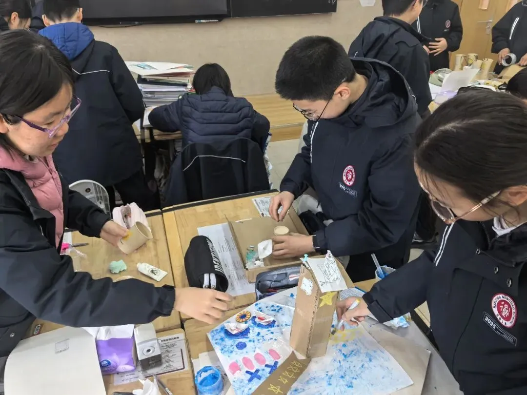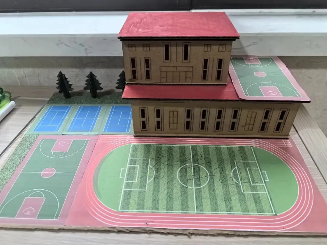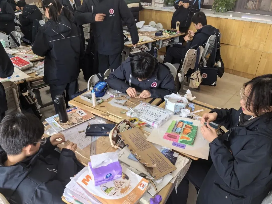 1月21日-22日,活动进入“搭建沙盘模型”的核心环节。各小组带着精心绘制的设计图,领取环保材料(彩色黏土、硬卡纸、干花、小石子、迷你摆件等),在美术老师的指导下投入创作。教室化身为创意工坊,随处可见专注忙碌的身影: