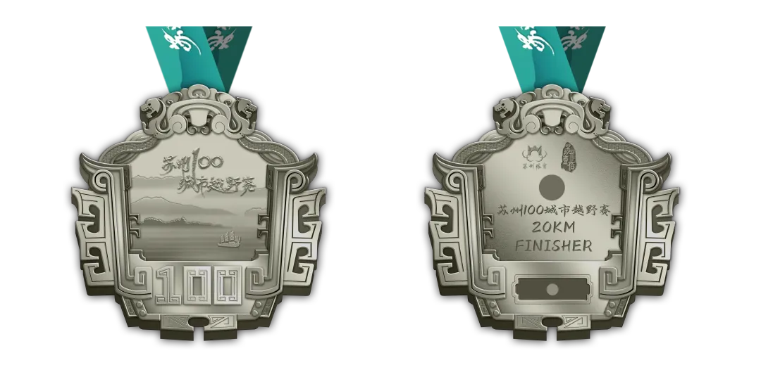 赛事奖牌的主体构造延续赛事LOGO的古朴风格,采用青铜器样式为设计灵感,挂坠处采用中国传统的蟠螭纹作为主纹样式,寓意美好吉祥,也代表了苏州100组委会对每位跑者的真切祝福。奖牌中央绘制一幅中国水墨画,与主视觉背景相呼应,画中穹窿山、西山、太湖、七桅古船等元素为奖牌增添几分苏州腔调,既有翻越山野的狂野奔放,又有畅游太湖的幽静安逸。
