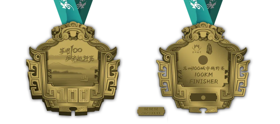 奖牌下方的100字样嵌入中国传统纹饰,两侧蟠螭纹向外延伸,使得奖牌左右元素对称,纹样形态各具特点,正面整体纹样、画样、字样三者结合,层次立体饱满。而背面则印有赛事相关LOGO、赛事名称、组别、完赛信息等内容,下方留有铭牌磁吸槽,组委会将在参赛包中配发铭牌,选手可在领物或完赛的奖牌刻字处刻上自己姓名和完赛日期,赋予奖牌独一无二的纪念意义。