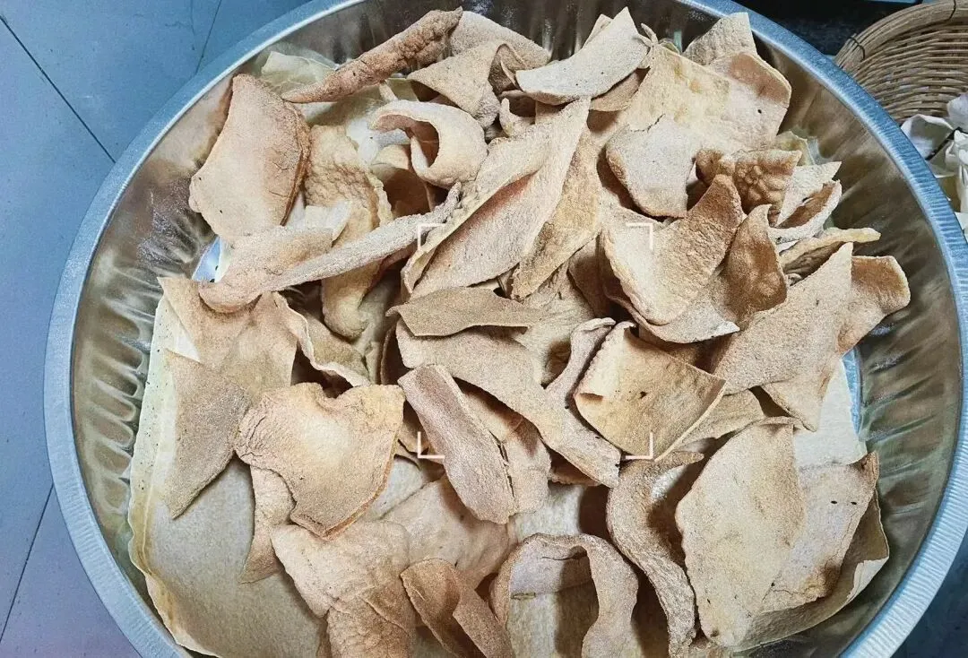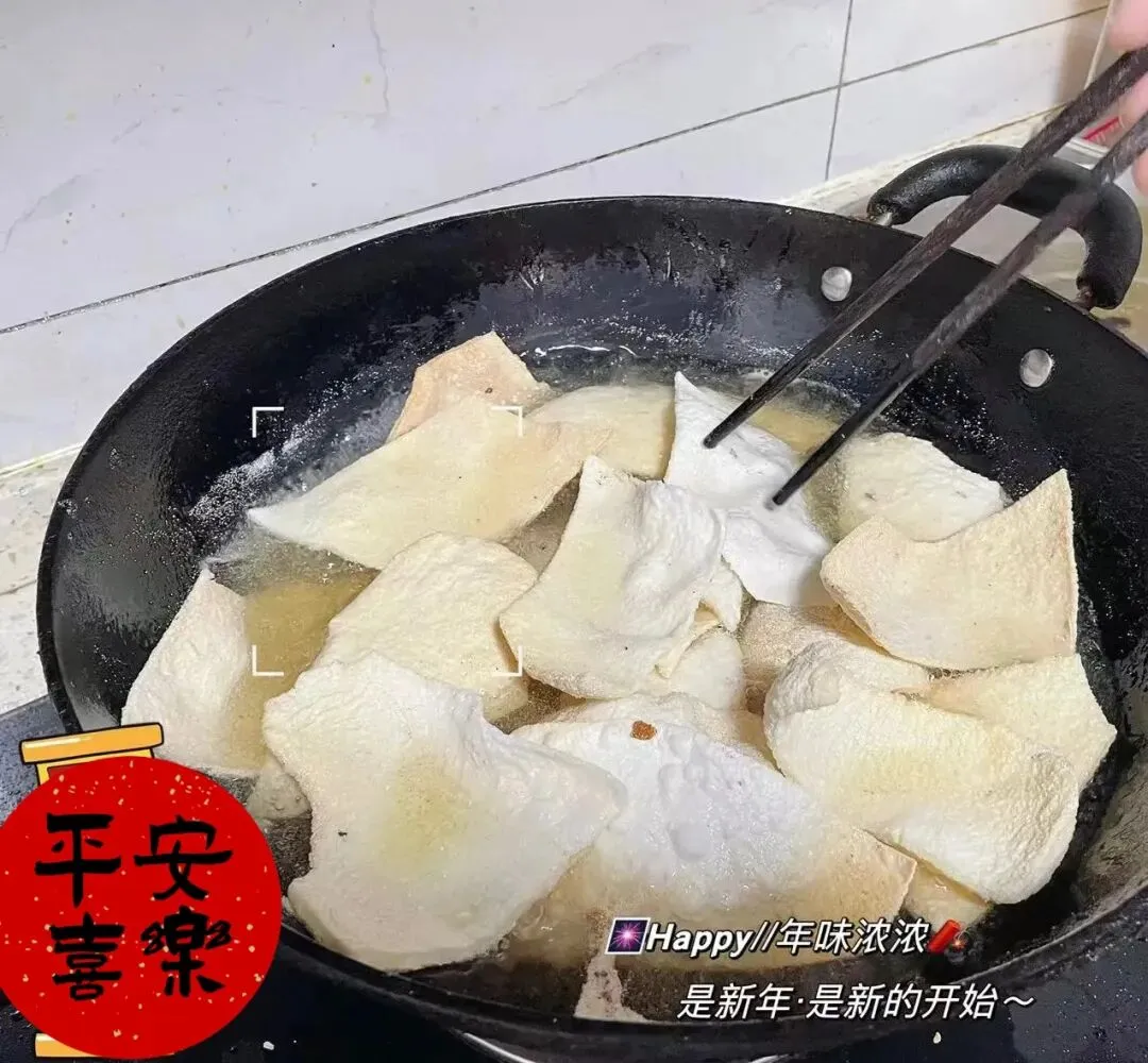 不过 如果晒得太干,就容易出现较多的碎片,像放鞭炮一样霹雳吧啦的,晾晒两三天即可收进屋里。临近过年,再拿出来在太阳下照晒个把小时即可油炸了。