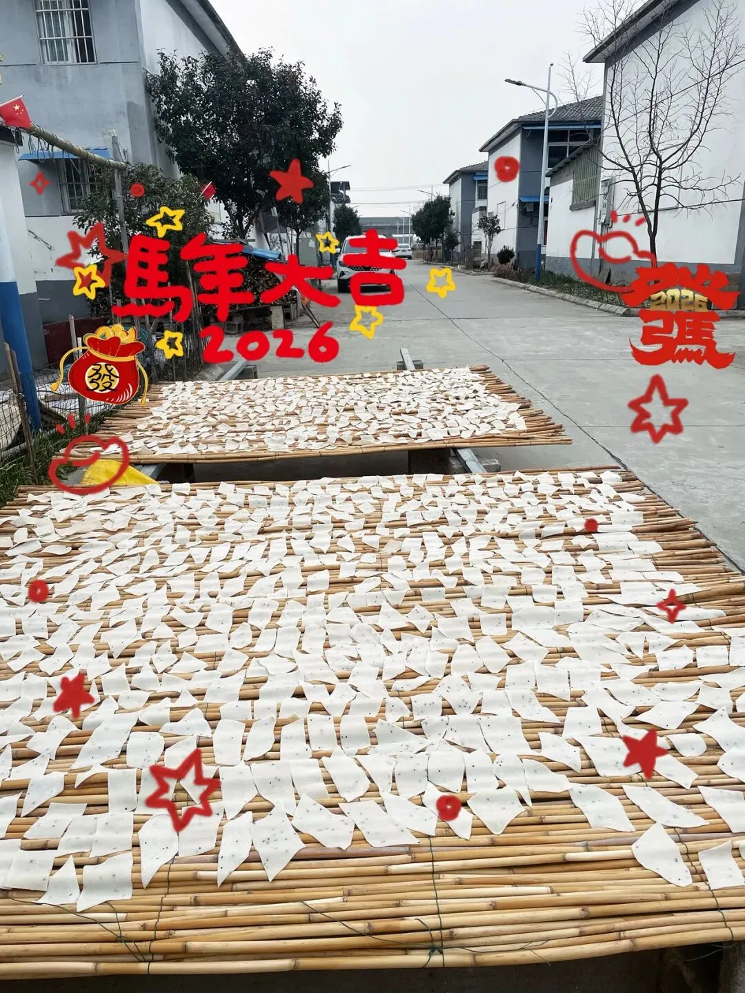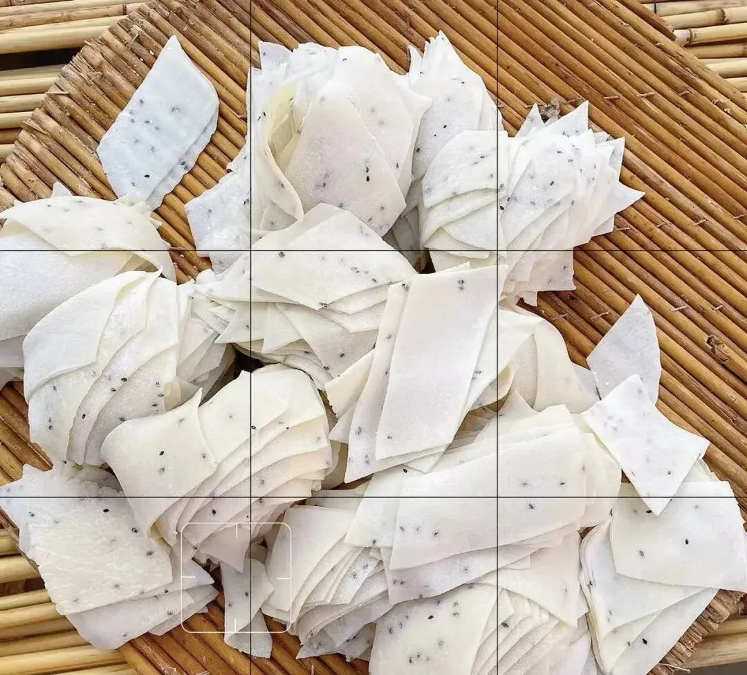 当时从小长大的老家还没拆,院子里摆了几个竹箔,我负责把已经切成菱形的坯子摆放在竹箔上晾晒,通常晒三四天,下雨的时候则收进室内,但是也得把坯子皮铺开,不然很容易黏在一块。等快过年的时候再去镇上赶集摆摊,生意倒还可以。