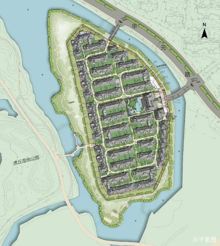 小区出入口设在华元路,靠两座桥连接社区,西边还有专属人行步道直通虎丘湿地公园,真正实现“一步进公园”。