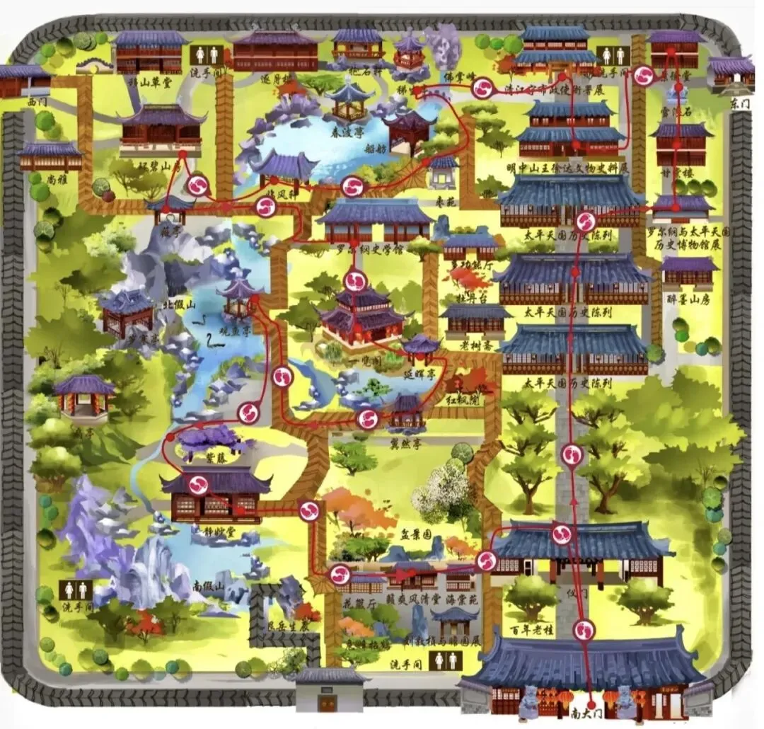 推荐顺序:南门进→太平天国历史博物馆(感受历史厚重)→虎字碑(沾福气)→仙人峰(北宋太湖石珍品)→静妙堂(赏湖景倒影)→南假山(拍全景绝佳机位)→北假山(探溶洞奇观)→一览阁(登楼俯瞰全园)→西门出