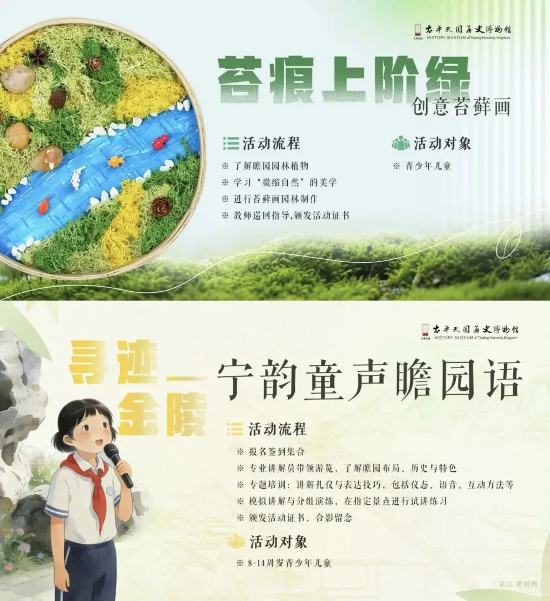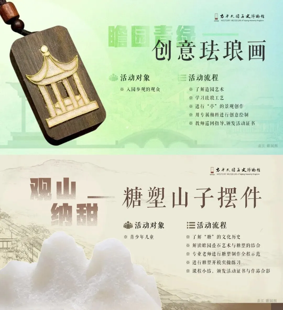 【瞻园】以园林美学为内容,开展“江南园林建筑巧工探索”社教限定课程,包括:瞻园青绿—创意珐琅画、观山·纳甜—糖塑山子摆件(2月7日10:00-11:30)、苔痕印阶—微缩园林造景·手工课程 、宁韵童声瞻园语·小小讲解员培训活动(2月5日、2月7日14:30-16:30)