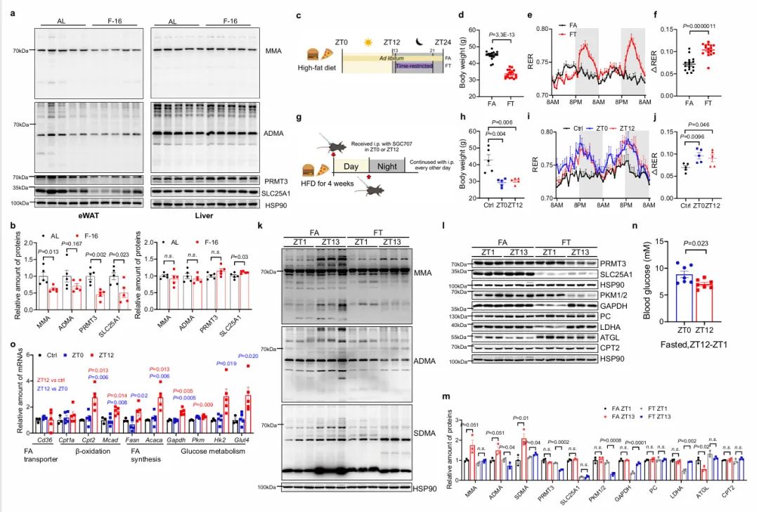 - 实施16:8 TRF的小鼠,其内脏脂肪中的PRMT3和SLC25A1水平显著降低;