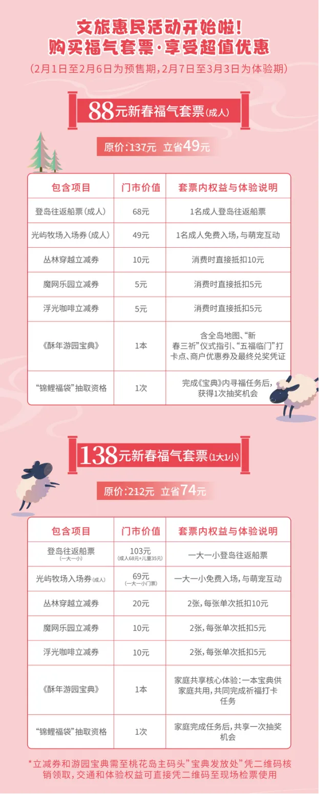 活动期间特别推出 “88元新春福气套票”与 “138元新春福气套票”,一站式涵盖桃花岛上往返船票、光屿牧场体验、丛林穿越、魔网乐园、浮光咖啡站等多重游玩项目与消费立减权益,适合个人漫游、亲子同行,尽享实惠与趣味。