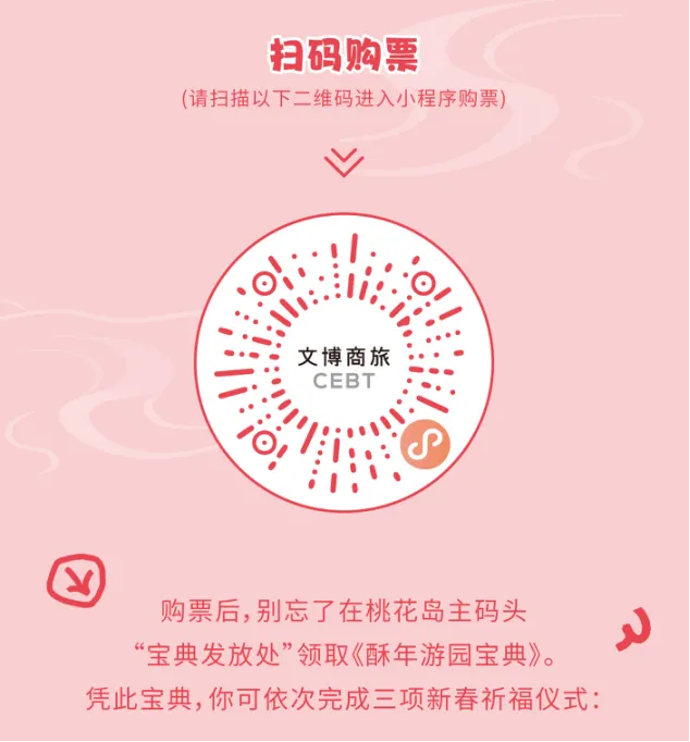 购票后可手持《酥年游园宝典》,即可轻松开启游园之旅。宝典不仅作为动线指引,更融合铃印纳福、丝带祈愿、系挂祥瑞等互动环节,让每位游客在参与中收纳祝福、记录年味。期间可在岛上完成打卡任务,还可参与“锦鲤福袋”抽奖,为新春之旅添一份惊喜。