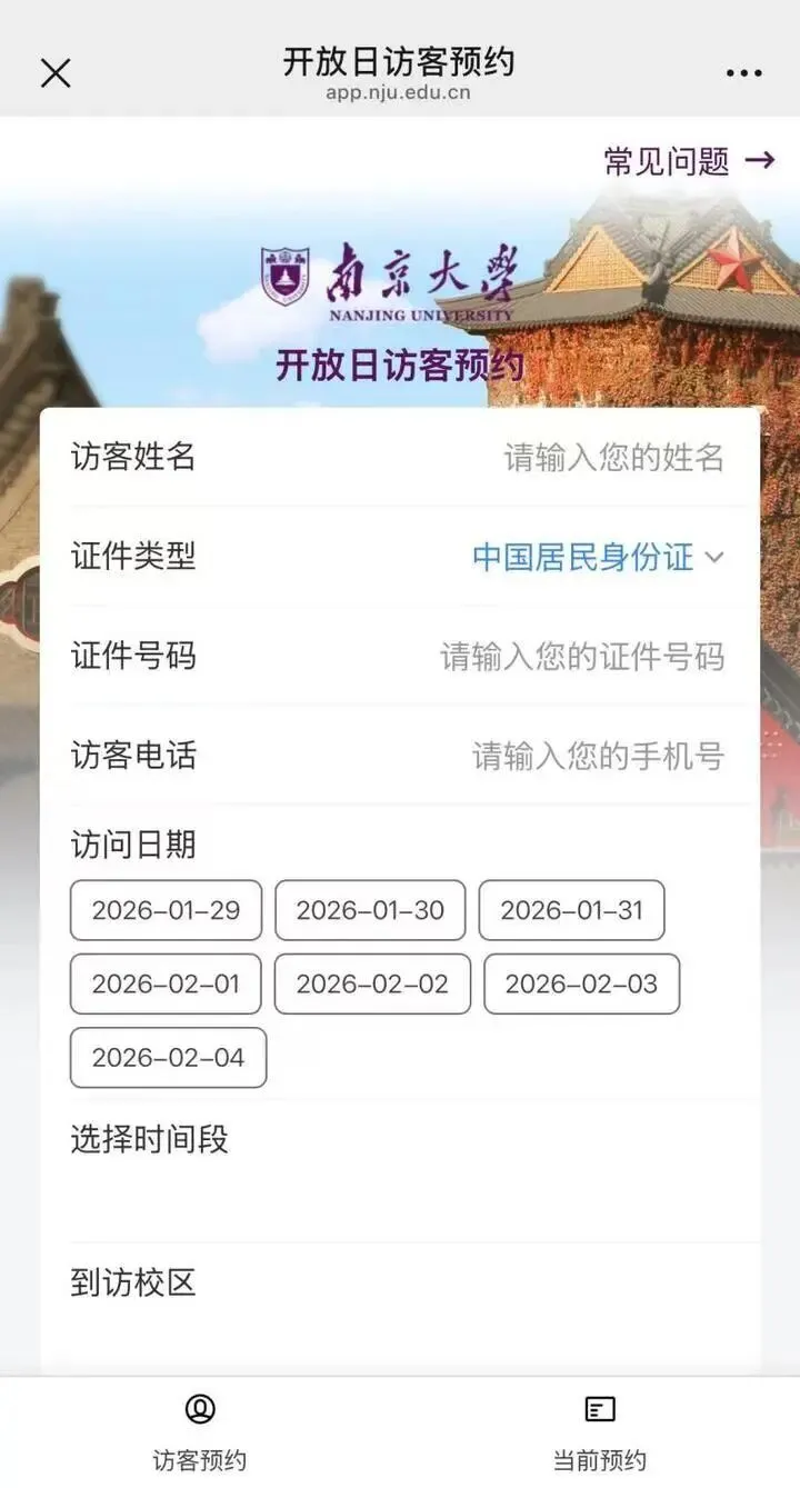 每日可预约入校参观时段为:09:00—17:00。访客通过“东南大学”微信公众号成功预约后,携带身份证或其他有效证件,由各校区东门校园参观专用通道进行人证核验,入校参观,并最晚于当日19:00前由东门离校。暂不开放参观者机动车入校。