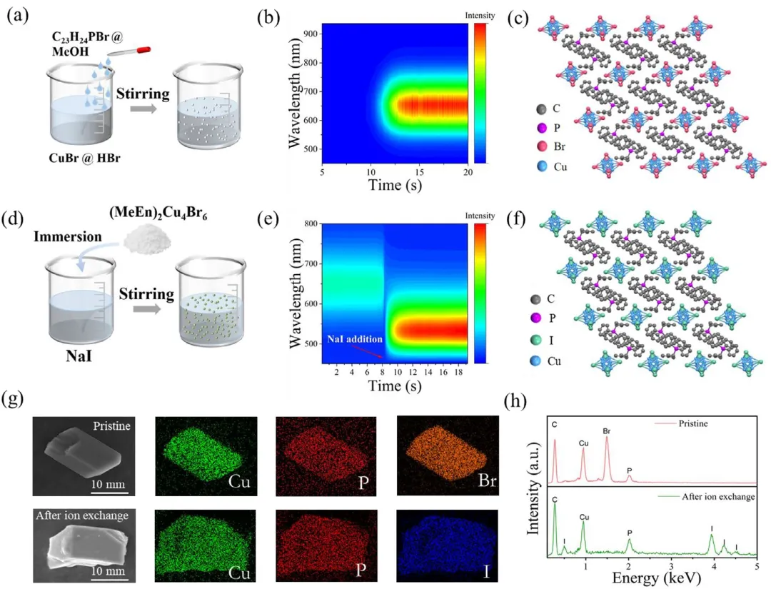图1:(a) (MeEn)₂Cu₄Br₆的合成示意图;(b) 监测(MeEn)₂Cu₄Br₆微晶形成的原位光致发光光谱;(c) (MeEn)₂Cu₄Br₆的单晶结构;(d) (MeEn)₂Cu₄I₆的离子交换合成示意图;(f) 揭示离子交换反应动力学的原位光致发光光谱;(g) 离子交换前后(MeEn)₂Cu₄Br₆微晶的扫描电子显微镜图像及其对应元素分布图;(h) 离子交换前后(MeEn)₂Cu₄Br₆的能量色散X射线光谱。图2:(a) (MeEn)₂Cu₄Br₆和(MeEn)₂Cu₄I₆的光致发光激发与发射光谱;(b) (MeEn)₂Cu₄Br₆和(MeEn)₂Cu₄I₆的时间分辨PL衰减曲线;(c) (MeEn)₂Cu₄Br₆和(MeEn)₂Cu₄I₆中[Cu₄X₆]²⁻团簇的平均键角方差 (σ²avg) 与键长畸变 (λavg);(d) (MeEn)₂Cu₄Br₆的变温PL光谱;(e) (MeEn)₂Cu₄I₆的变温PL光谱;(f) (MeEn)₂Cu₄Br₆和(MeEn)₂Cu₄I₆的黄-里斯因子 (S)、电子-纵向光学声子耦合强度 (γLO) 以及LO声子能量 (ELO)。图3:(a) (MeEn)₂Cu₄Br₆、(MeEn)₂Cu₄I₆、Bi₄Ge₃O₁₂ (BGO)、PPN₂SbCl₅ 和 (TPPen)₂MnBr₄在不同光子能量下的X射线吸收系数;(b) (MeEn)₂Cu₄I₆、(MeEn)₂Cu₄Br₆和BGO的辐射发光光谱;(c) (MeEn)₂Cu₄I₆的辐射发光强度随剂量率的变化关系;(d) 连续X射线照射下(MeEn)₂Cu₄I₆积分辐射发光强度的演变;(e) (MeEn)₂Cu₄I₆与文献报道的铜卤化物闪烁体的光产额和衰减寿命对比。图4:(a) 通过(MeEn)₂Cu₄I₆@SEBS薄膜获取的不同目标物的静态X射线图像;(b) 通过(MeEn)₂Cu₄I₆@SEBS薄膜获取的标准线对卡的静态X射线图像;(c) 使用(MeEn)₂Cu₄I₆@SEBS薄膜对移动胶囊进行的实时动态X射线成像;(d) 通过平面(MeEn)₂Cu₄I₆@SEBS薄膜获取的曲面金属徽章X射线图像;(e) 通过保形弯曲的(MeEn)₂Cu₄I₆@SEBS薄膜获取的曲面金属徽章X射线图像。图5:(a) (MeEn)₂Cu₄I₆@SEBS薄膜浸泡于水中不同时长的照片 (薄膜受365 nm激光激发);(b) 储存于水中的(MeEn)₂Cu₄I₆@SEBS薄膜的辐射发光强度随时间演化;(c) 水下X射线成像装置示意图;(d) 展示(MeEn)₂Cu₄I₆@SEBS薄膜与内含弹簧的扇贝壳浸没于水中的照片;(e) 通过水下X射线成像获取的内含弹簧扇贝壳的X射线图像。