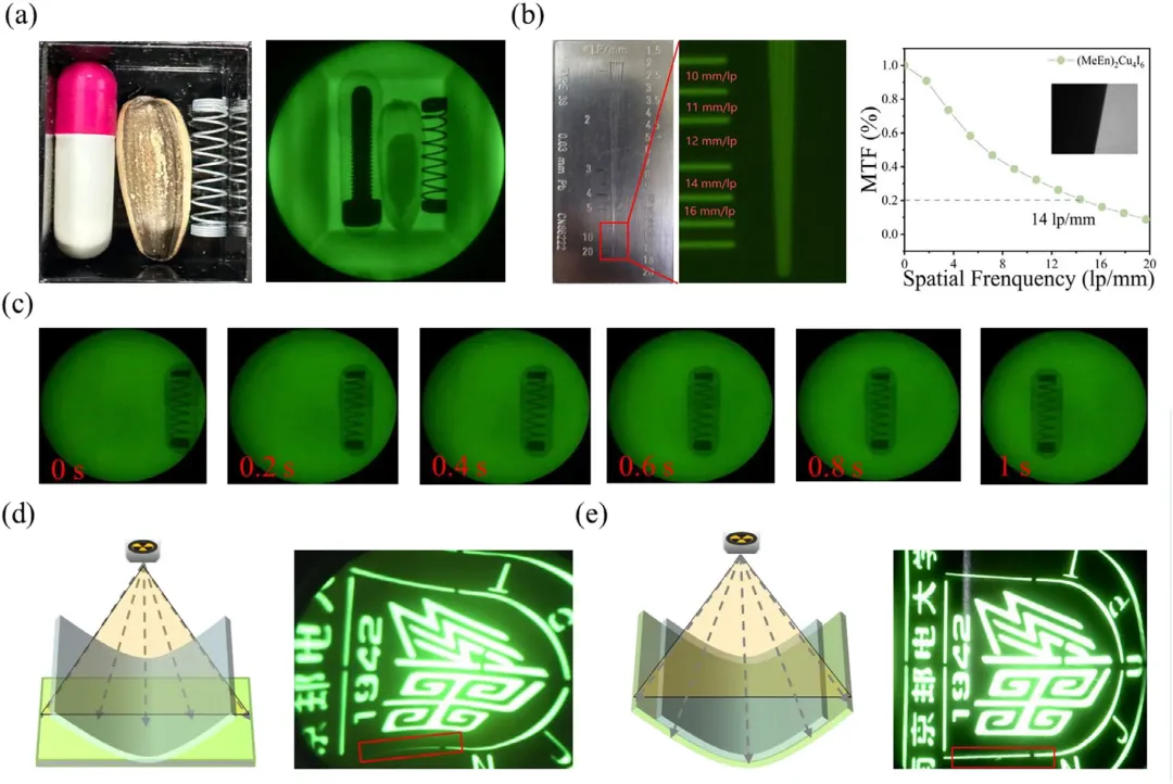 本研究开发了一种卤化物交换方法,可在数秒内将(MeEn)₂Cu₄Br₆快速转化为(MeEn)₂Cu₄I₆。这一转化实现了接近100%的光致发光量子产率、1.7倍的光产额提升 (达39700 phMeV⁻¹) 以及15倍的发光衰减时间缩短 (至2.4 µs)。重要的是,该方法具有普适性,可推广用于提升多种铜卤化物的闪烁性能。机理研究表明,[Cu₄X₆]²⁻团簇中的晶格畸变、电子-声子耦合强度以及重原子诱导的强自旋-轨道耦合是影响零维铜卤化物光物理性能的关键因素。得益于高光产额与微秒级发光衰减时间,(MeEn)₂Cu₄I₆@SEBS闪烁薄膜在静态X射线成像中实现了14 lp mm⁻¹的空间分辨率,并展示了无运动模糊的动态X射线成像能力。此外,该薄膜表现出优异的机械柔韧性和突出的耐水性,使其能够应用于曲面及水下X射线成像。这项工作不仅实现了多场景下的高分辨率X射线成像,更为设计兼具高光产额与快速发光衰减的铜卤化物闪烁体提供了重要的设计思路。